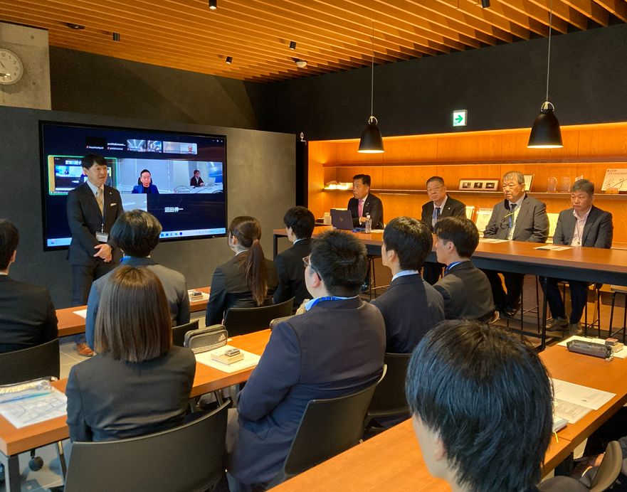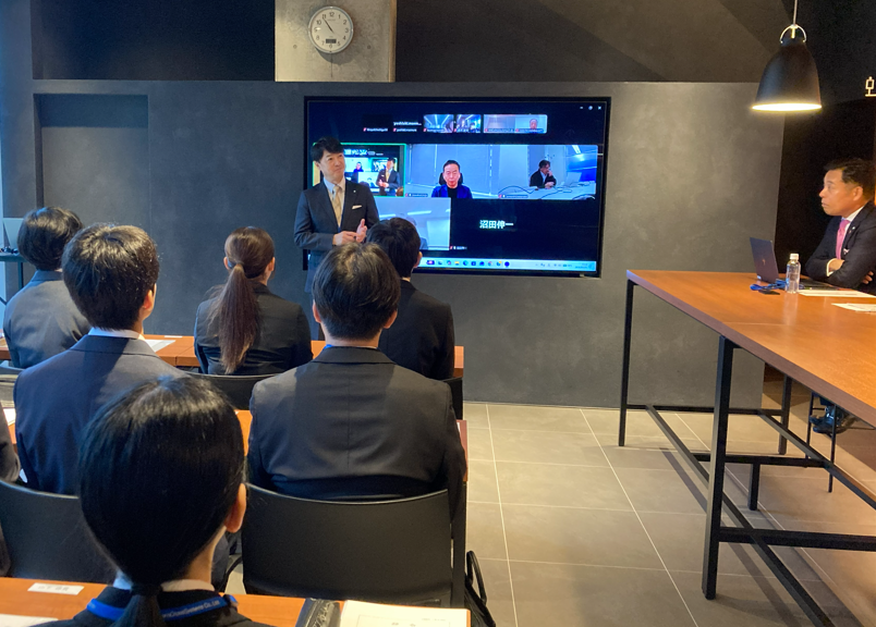 東京本社、関西事業所、福岡事業所ともオンラインでつないで、フレッシュな新人を各地から激励しました。